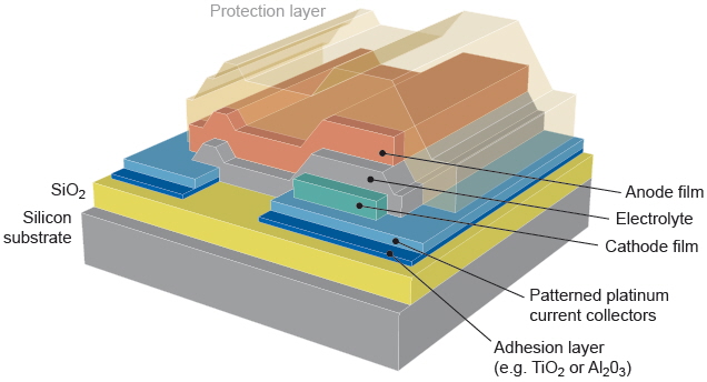 Figure 1: Thin film rechargeable Li-ion battery stack integrated on a silicon wafer. It consists of the cathode, a solid state electrolyte, and an anode. The anode and cathode, respectively, are contacted by the patterned platinum bottom electrodes in this example.