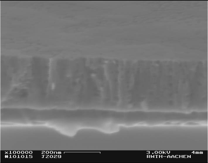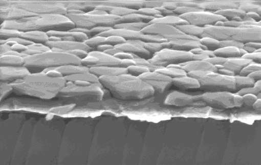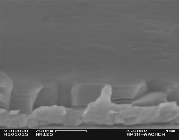 In order to optimize the performance several material combinations will be investigated. The first steps are devoted to the development of a suitable cathode material. In these experiments Li and Co carboxylate based precursor solutions have been prepared, deposited on platinized silicon wafers and crystallized. Figure 2 shows the field emission scanning electron microscope (FESEM) image of a CSD derived LiCoO2 thin film as one example. The film posses a dense and plate like columnar microstructure.