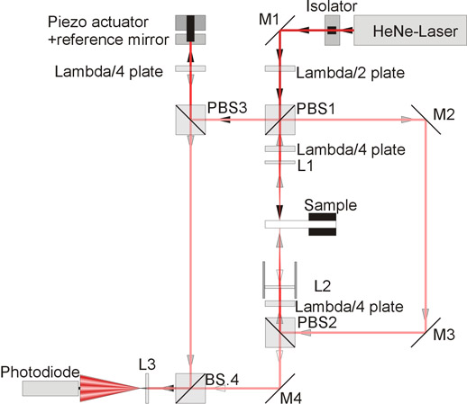 Instead, laser interferometry and scanning probe microscopy are used for this field of research, as both methods allow the nondestructive and within limits noninvasive characterization of ferroelectrics. The heterodyne double-beam laser interferometer setup (Figure 1) especially suited for thin film characterization, since this technique eliminates sample motions caused by bending. In combination with thermal, optical, vibration and air pressure insulation, it is possible to build an instrument capable of measuring the thickness change of a ferroelectric thin film under electrical field application with a sub-atomic resolution (<100 pm). Furthermore, no calibration measurement is needed, since the thickness change of the sample can be calculated directly from the photo detector response by: