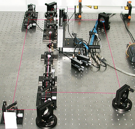 Figure 3: Close up view of the actual optical setup with indicated beam path. The beam exits on the lower left of the picture and is widened for intensity reduction and measurement of the center intensity.