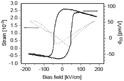Using the lock-in measurement method used for short-time C/V measurements, it was possible to decrease the measurement time from several minutes to one second (∼1Hz). Additionally, the number of measurement points was increased from 200 to 5000. This method uses an external signal generator in combination with a simple operational amplifier circuit to superimpose the small signal generated by the lock-in over a relatively fast changing bias signal. Direct use of the internal lock-in oscillator helped to stay locked on the measured response and eliminated the need for a transmitted reference signal. Also, the electromechanical small-signal response could be acquired by and investigated with a digital oscilloscope. PC based measurement processing was only needed for calculation of the absolute values and data storage. At typical curve for PZT thin films near the morphotropic phase boundary (MPB) is shown in Figure 5. Furthermore, the lock-in method gives the ability to measure the electric small-signal characteristics of the sample without opening the chamber.