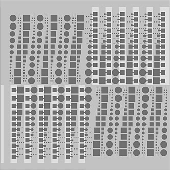 Figure 6: Mask layout for electromechanical measurements on small top electrode geometries (top right and bottom left corner). A striped bottom electrode is combined with dumbbell shaped top electrodes in order to separate the active capacitor area from the point of electrical contact.