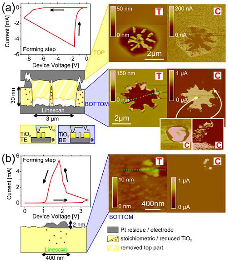 In order to proceed from its initially high resistive virgin state to a resistive switching state, a sample needs to be electroformed. This can be achieved by applying either a negative voltage sweep – resulting in the ON state – or a positive voltage sweep, resulting in the OFF state. Figure 1a contains the I–V data of a negatively formed junction. Upon delamination the structure falls apart into two pieces: a bottom part and a top part. The C-AFM images in Figure 1a show the topography and conductivity of both parts, while the green linescan as well as its coloured depiction below the I–V curve outline this separation. The C-AFM sample setup is sketched for the bottom as well as for the flipped over top part in the two small pictograms beneath. The bottom part exhibits a several micron sized hole situated somewhere across the junction area with an approximately 200 nm wide pillar in the middle and some elevated regions at the boundaries. The depth of the hole is equal to the TiO2 film thickness. The overall bottom part therefore consists of the bottom electrode with the complete oxide layer sitting on top - except for the hole; within the hole all TiO2 has been pulled out during delamination making the ground equivalent to the Pt bottom electrode. The top part is the exact counterpart of the bottom part. It consists of the small amount of TiO2 that was plucked out of the sample, sitting on top of the top electrode. Taking a closer look at the conductivity of both parts, the Pt top and bottom electrodes can be seen as very well conducting regions. The plucked TiO2 of the top part as well as the main part of the TiO2 in the bottom part image is non-conducting. The conductivity and therefore also stoichiometry of those areas was obviously not affected by the forming step. The only current carrying regions of the whole device are located at the central pillar and the boundary regions of the hole structure. Both possess an increased conductivity compared to the surrounding stoichiometric TiO2 film and are shown in the insets of Figure 1a. From their conductivity we infer that they consist of reduced TiO2. The height of the central pillar as well as the boundary regions is slightly larger than the film thickness, making them protrude above the average TiO2 surface. Photo Emission Electron Microscopy (PEEM) reveals that the boundary regions were crystallized during the electroforming step and that the central pillar is covered with a residual Pt layer - accounting for the additional height and preventing immediate reoxidation [5]. The whole very characteristic structure can be explained by the formation of an original conducting TiO2-x channel (central pillar) by Joule heating and oxygen vacancy migration together with the evolution of an oxygen bubble at the lower interface around this channel. This bubble delaminated the oxide film from the bottom electrode and eventually also broke the contact between the central channel and the top electrode. Further current flow occurred only along the boundaries of the bubble, heating and crystallizing them and therefore causing an increased adhesion between film and Pt electrode in these areas. The confinement of the current to the boundaries of the hole and the rupture of the central channel is also supported by local pressure modulated AFM measurements prior to removing the electrode [4]. Positive electroforming (Figure 1b) also results in a localized conducting region but the overall changes to the sample structure are much less dramatic. In this case a small conducting spot appears at the edge of the junction together with a roughly 400 nm wide and 2–3 nm high elevation in the topography. The region of the conducting spot also shows a heat-induced crystallization (as determined by PEEM) and likely reduction of the film with an increased adhesion to the top electrode and a small residual Pt layer.