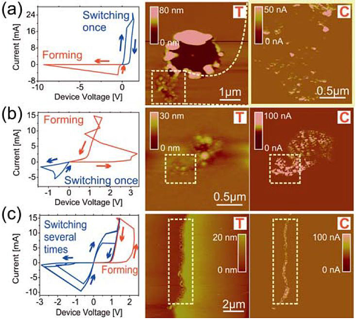 Figure 2: Influence of resistive switching on the morphology and local conductivity of the sample. I–V and C-AFM data are shown for a sample negatively formed and switched once (a), a sample positively formed and switched once (b), and a sample positively formed and switched several times (c). In addition to the forming spot further conducting areas emerge due to the switching steps. They are marked by dashed rectangles.