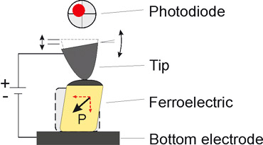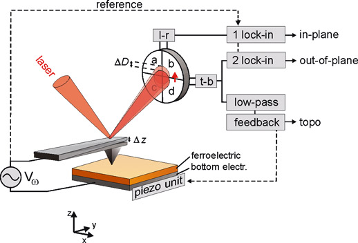 Figure 1: PFM setup to simultaneously acquire the topography and the in- and out-of-plane component of the polarization. A function generator is used to apply an alternating voltage Vw between the tip and the bottom electrode of the ferroelectric. The voltage induced cantilever deflection is detected by a reflected laser beam on a four sector photodiode.