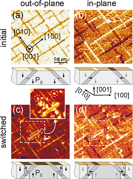 Figure 3: Piezoresponse images of an epitaxial poly-domain PZT thin film in the as grown state, (a) out-of-plane image, (b) in-plane image and after poling (c), (d). Regions with bright, dark, and intermediate contrast correspond to different domains, as shown schematically in the sketches below the PFM images. The inset in (c) shows the region from where the back-switching starts. Circled areas in the inset indicate reversed needle-like 180° domains near 90° walls.