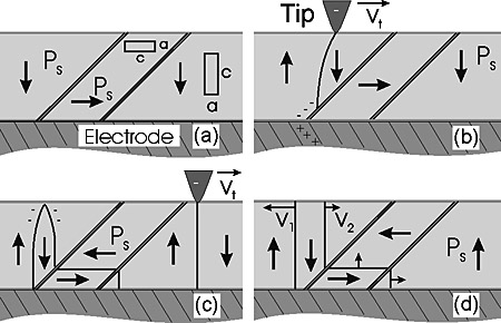 The actual ferroelectric peculiarity, the reversibility of the spontaneous polarization make ferroelectric materials promising candidates for being used as storage media in future non-volatile memory devices. In the growing field of applications for ferroelectric thin films it is of great importance to understand the switching behavior of ferroelectric thin films in the nanoscale regime. Recent advances in the scanning force microscopy made it possible to image the nanoscale polarization reversal of ferroelectric films. A powerful tool to investigate and manipulate the domain structure is a modification of the scanning probe microscope (SPM) termed piezoresponse force microscope (PFM). A sketch of the PFM is shown in Figure 1. A phenomenological theory is used to explain the experimental observations.