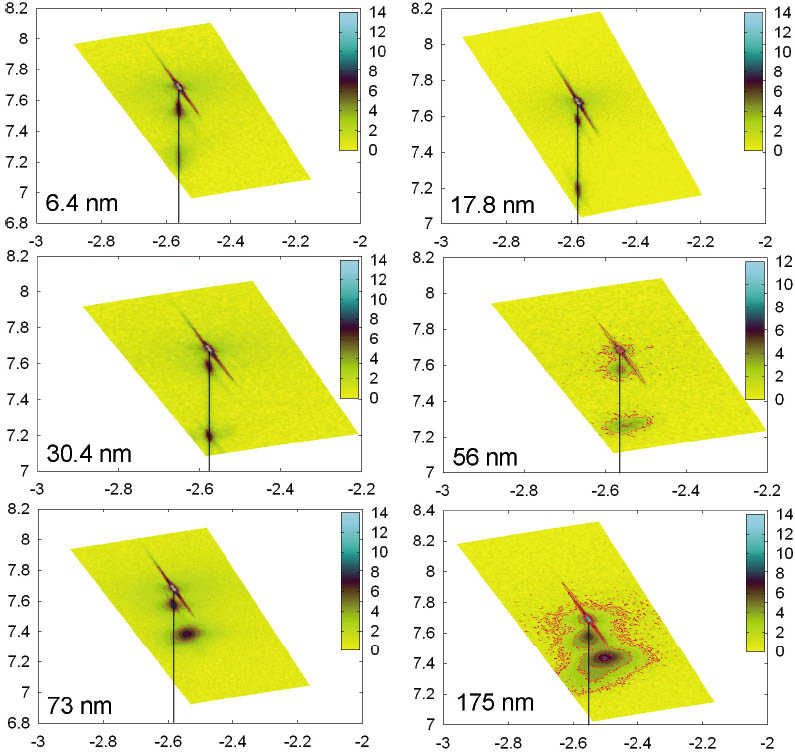 Figure 1: X-ray reciprocal space mapping (X-RSM) around the asymmetric (103) Bragg reflection for BaTiO3 films of several different thicknesses.