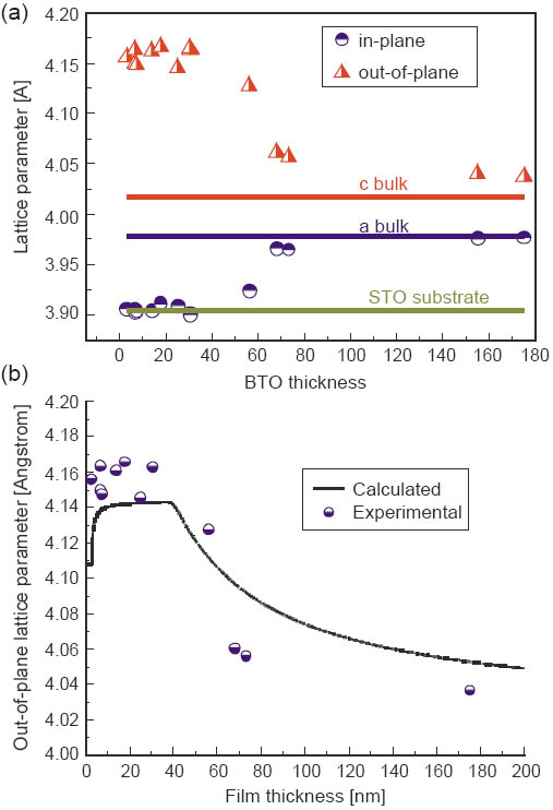 Figure 2: (a) Variation of the lattice parameters as a function of film thickness; (b) Calculated and measured thickness dependence of the polarization in epitaxial BTO films.