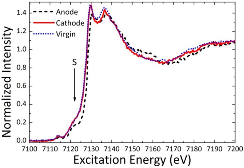 In this contribution, the distribution of oxygen vacancies in a switched memristor cell fabricated from epitaxial Fe-doped SrTiO3 will be investigated by spatially resolved x-ray absorption near-edge structure (XANES). SrTi0.95Fe0.05O3 was grown epitaxially by pulsed laser deposition (PLD) on a conducting Nb:SrTiO3 substrate. Pt top electrodes were sputter-deposited and structured via optical lithography. XANES measurements at the Fe K-edge with a 7 μm beam spot on the sample were performed at the beamline ID03 (ESRF, France). Figure 1 compares the Fe K-edge XANES of the virgin thin film to that recorded in the anodic and cathodic regions of an electrocolored single crystal [3]. The cathode was found to contain only Fe3+ ions and Fe3+-VO complexes in the ratio ~ 70/30, and notably no Fe4+ [3]. The almost perfect coincidence of the thin film XANES with that of the reduced cathode implies that the virgin thin film is already oxygen deficient after growth, and that the Fe3+/Fe4+ redox pair does not serve as an indicator for local resistance changes. The shoulder at 7122 eV excitation energy that marks Fe3+-VO complexes is indicated by “S” in Figure 1.
