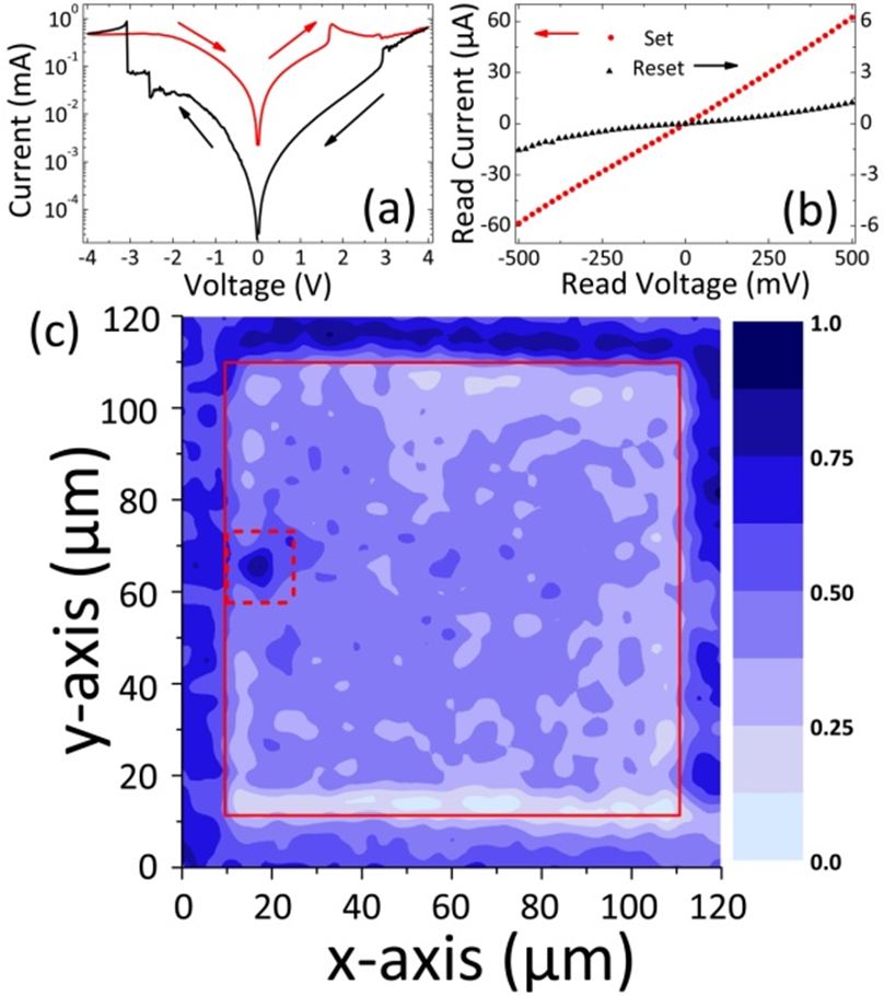 After an electroforming step with a +7 V DC voltage applied to the top electrode, the formed memristor can be switched between different resistance states with a bipolar voltage sweep. The current-voltage hysteresis is shown in Figure 2(a), the “Set”-state is reached with a negative voltage sweep polarity. A low voltage readout (Figure 2(b)) reveals the “Set”-state to show ohmic behavior, while the “Reset”-state shows distinctly non-linear behavior.