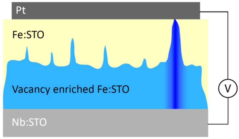 The important consequence is that before breakdown is achieved during the electroforming, a homogeneous front of vacancy enrichment propagates into the material. Furthermore, the Fe K-edge XANES at the filament location is interpreted via full multiple-scattering calculations and indicates oxygen vacancy clustering in the first shell of Fe [4]. The oxygen vacancy distribution in the formed device is sketched in Figure 3.