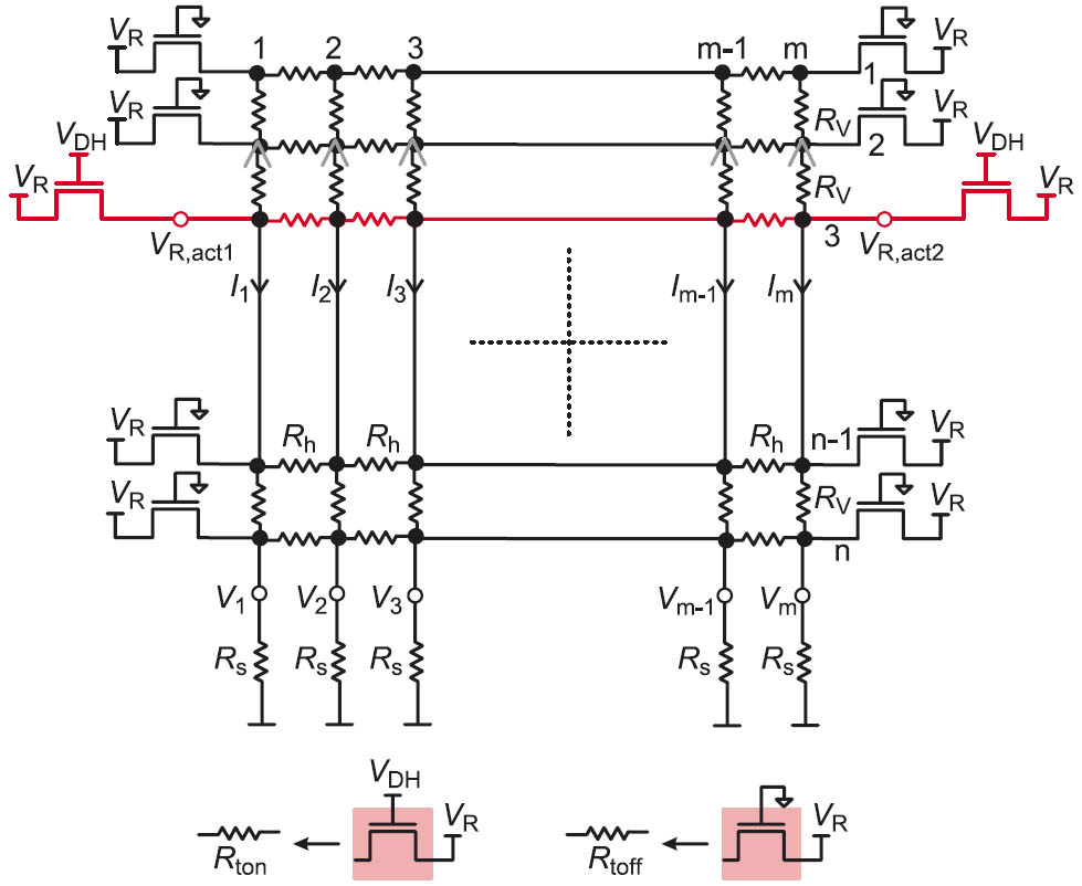 Due to the voltage drops at the interconnects, the sensing elements and since the non-accessed cells are not isolated, parasitic currents will flow through the memory cells in the non-accessed rows. In addition, the resistance of the row access transistors will reduce the actual read voltage VRact applied to the row because they construct a voltage divider with the equivalent resistance of the rows.