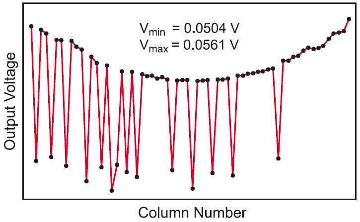 The non-accessed rows are left open which means that the row access transistors are turned off and have an equivalent resistance of Rtoff. To reduce the voltage degradation, voltage is applied from both sides of the array. The output voltages resulting from reading a row of a 64 × 16 bit array are shown in Figure 2.