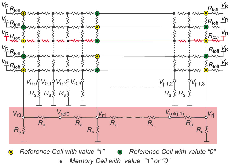 An ideal reference voltage would be the average value of the “1” and “0” voltage levels. To generate the local reference voltages, every two adjacent reference columns are connected together using two identical resistors (Ra) as can be seen in Figure 3. The equivalent circuit of any two adjacent reference cells in any row is shown in Figure 4.