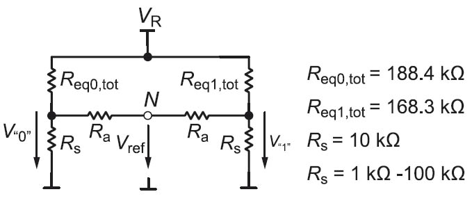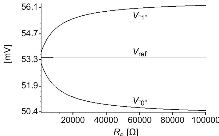 The values of the used resistors Ra are not critical. To illustrate this, the total equivalent resistance connected to the two sense resistors is calculated from the voltage drops on them. After that, the effect of sweeping the value Ra on the voltages V”1”, V”0”, and Vref is investigated. Which “1” or “0” is chosen from a row does not impose any restrictions on this concept. Thus we will consider the voltages of the “1” with the highest voltage and the “0” with the lowest voltage in Figure 2. These voltages are 56.1 mV and 50,4 mV respectively which correspond to the equivalent resistances of 168,3 kΩ and 188,4 kΩ connected to the sense resistors as shown in Figure 4. The simulation results obtained by sweeping the value of Ra from 1 kΩ to 100 kΩ are shown in Figure 5. As can be seen, V”1” and V”0” are degraded especially for small values of Ra but the reference voltage stays practically constant.
