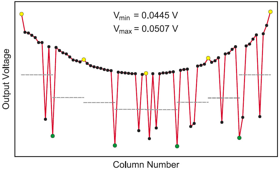 Figure 6 shows the output voltages resulting from reading a row from 64 × 16 bit logical memory, which is physically 73 × 16 crossbar array after inserting the reference cells. In this simulation every ninth cell is a reference cell.