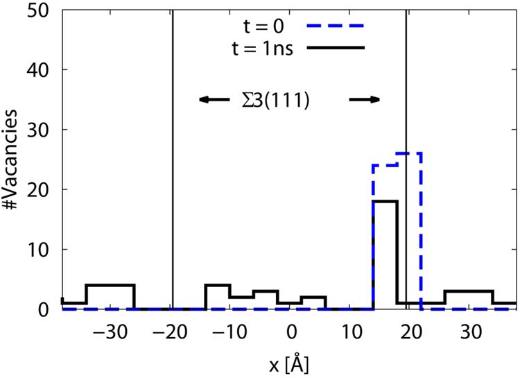 The diffusion of oxygen vacancies near two Σ3(111) grain boundaries was investigated by introducing an initial distribution of vacancies near one of the two grain boundaries. The comparison of initial and final distribution after 1 ns MD simulation at 1000 K in Figure 2 indicates the tendency of vacancies to accumulate at the grain boundary.