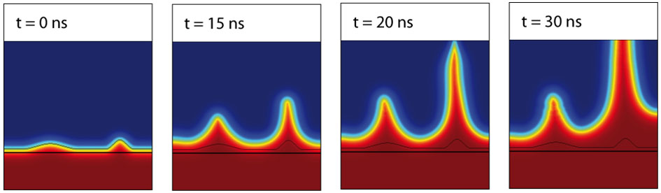 Figure 1: 2D FEM simulation of the filamentary growth during SET operation in an ECM cell with two seeds.