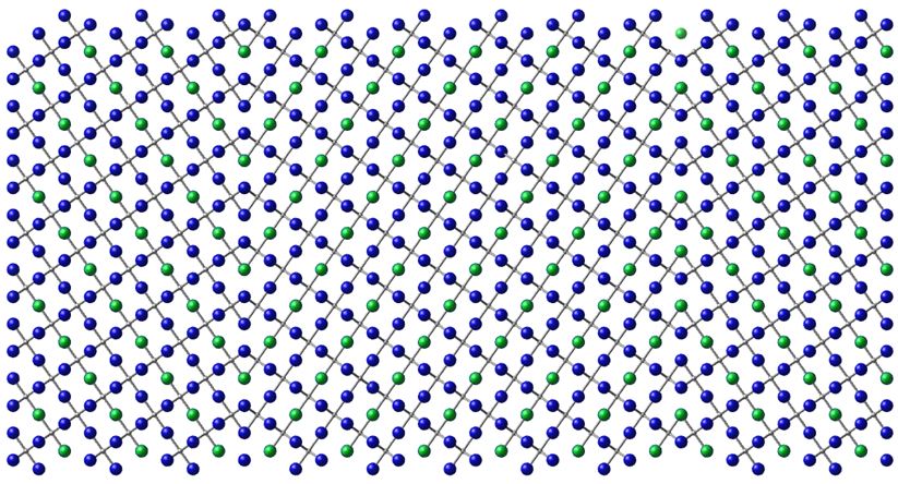 Figure 4: Simulation cell of SrTiO3 with two Σ3(111) grain boundaries including 8160 ions (blue: oxygen, green: strontium, grey: titanium).