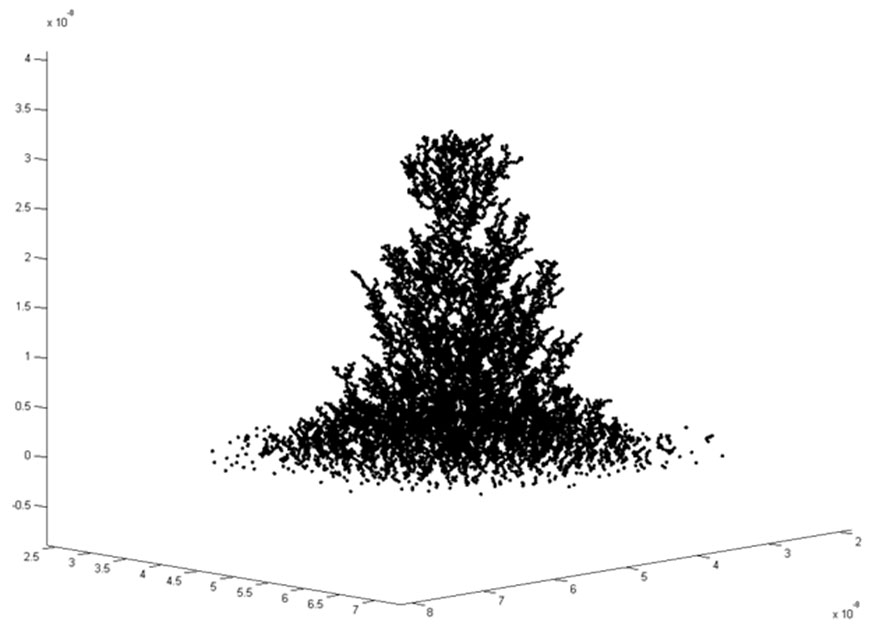 We used a molecular dynamics to simulate the Brownian motion of copper ions in an applied electric field. The interactions between different copper ions are modeled using suitable potentials. In addition the attraction of the negatively charged dendrite and the copper ions is taken into account. This simulation results in a dendrite growth as shown in Figure 5.