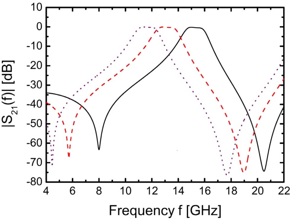 Figure 8: Simulated transfer characteristics of a tunable bandpass filter using ferroelectic varactors at high GHz frequencies.