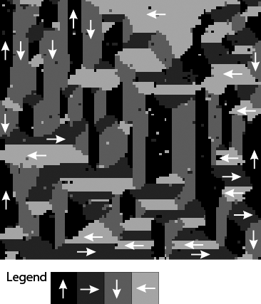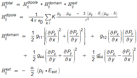 In this model, each ferroelectirc is made up of constant dipole moments, representing a single dipole moment of a unit cell arranged in a 2D square lattice. All 4 possible orientations in a tetragonal ferroelectric were established and 90° as well as 180° domain walls can be formed. The simulated lattice was sized from 50 x 50 to 200 x 200 cells. A distributed computing approach was used to allow the simulation of a whole in parallel. To calculate the physical behavior of the dipoles one has to define an Hamiltonian, which describes that interactions correctly. The used Hamiltonian here consists of 3 different terms. The first one describes the long-range dipole-dipole interaction, the second one penalizes the system for building up gradients by introducing a polarization gradient energy, and the last one takes the interaction of dipoles with an external electrical field into account:
