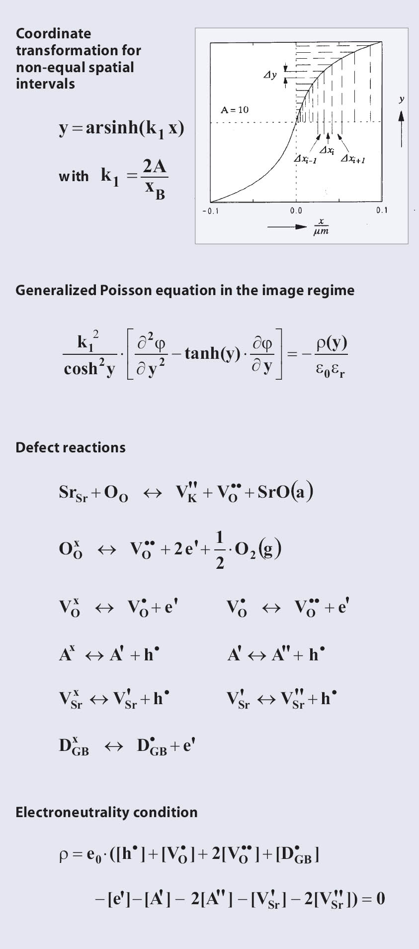 The simulations were perform-ed in a first step along a one-dimensional axis perpendicular to the GB. A special mathematical transformation allows to adapt the position of the discrete calculation points according to the location of the largest gradients of the simulation quantities. The discretization of the Poisson-equation in combination with the system of mass action equations for all defect chemical reactions leads to a comprehensive system of nonlinear equations which is solved by the Newton-algorithm.