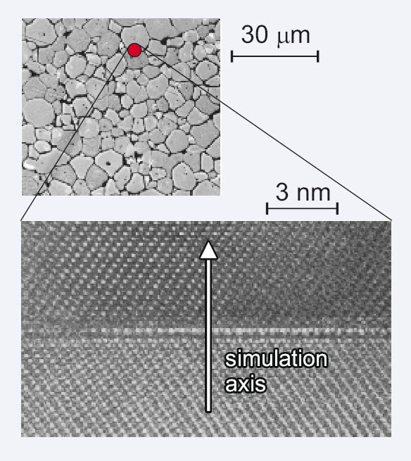 Figure 1: Upper diagram: Microsection of the etched surface of a 0.1 at% Ni-doped SrTiO3 ceramic. Lower diagram: HRTEM-diagram of the same ceramic, showing two grains separated by one GB