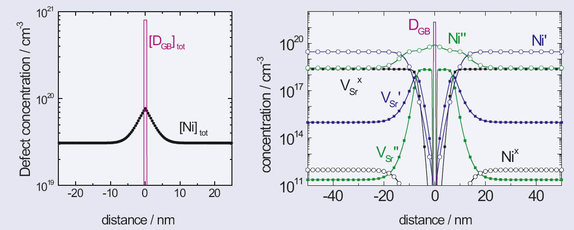 This leads to a detailed picture of the defect chemistry near the GBs which is completely different from the situation within the space-charge-free bulk. Furthermore, the spatial profiles of the band bending, the electrostatic potential, the electrical field, and the conductivity are calculated along the simulation axis.