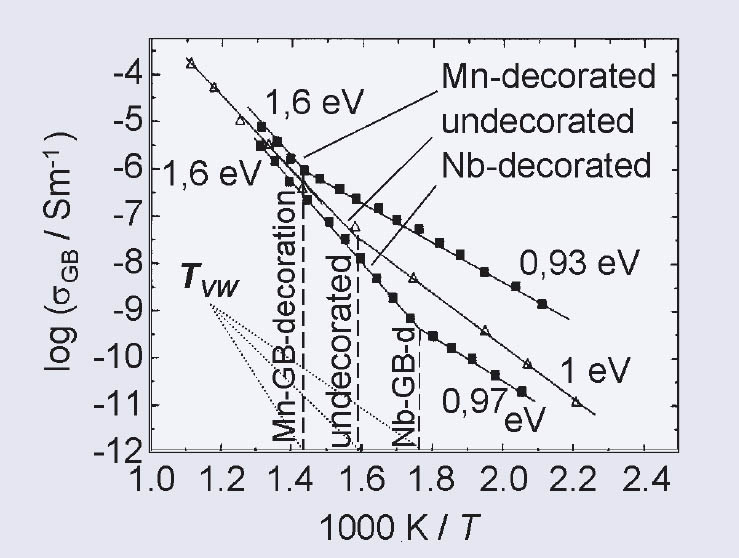 Figure 3: GB conductivity in an Arrhenius plot for undecorated, Mn- and Nb decorated SrTiO3 ceramic