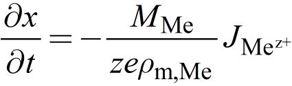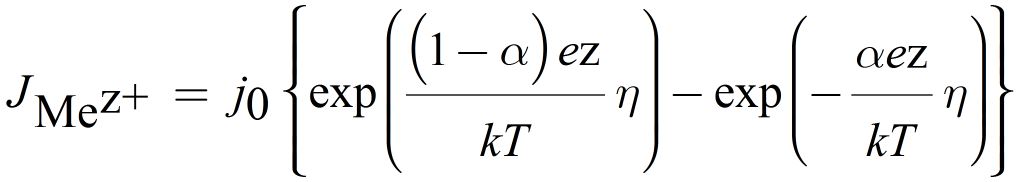 Here, JMez+ is the ionic current, z the charge transfer number, MMe the atomic mass and ρm,Me the mass density of deposited metal. The redox reactions at the electrodes involve an electron transfer reaction. The resulting current density due to this charge transfer is described by the Butler-Volmer equation and defines the ionic current