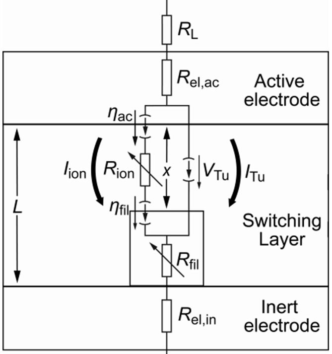 Figure 1 shows a schematic of the simulation model. The metallic cylindrical filament growth from the inert bottom electrode through the SL and modulates the tunneling gap x. Within the SL ionic and electronic tunneling currents are present. The ionic current path is modeled by two voltage controlled current sources (ηac, ηfil), which represent the electron-transfer reactions at the boundaries (see explanation below), and the resistance due to ionic drift Rion(x). The electronic current path is attributed to electronic tunneling, represented by one voltage controlled current source VTu. The LRS is reached as the tunneling gap is small enough to enable significant tunneling current.