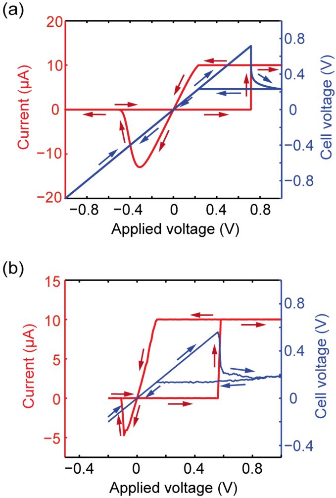 Figure 2: (a) Simulated I-V curve (red) and corresponding relation between Vcell and Vapplied (blue). (b) Experimental I-V characteristic for a Cu/SiO2/Pt cel.l (Redrawn from [3]).