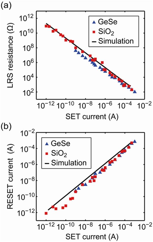 Figure 3: (a) LRS resistance vs. SET current and (b) corresponding RESET current vs. SET current. The simulation results for (a) and (b) are depicted as black solid lines. Experimental data is displayed as blue triangles for a Ag:GeSe system [4] and as red squares for a Cu:SiO2 system.[4] The filament radius is rfil = 8 nm.(Rredrawn from [3])