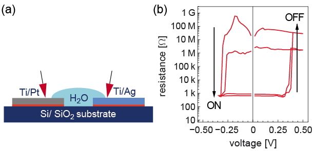To facilitate the observation of the switching processes, a coplanar structure, instead of the common metal-insulator-metal stack structure, was fabricated on SiO2 substrates by photolithography [3]. Cells consisting of an oxidizable Ag electrode, de-ionized water and an inert Pt electrode were prepared as model systems for the electrochemical metallization cells (Figure 1 (a)). The gaps between the Pt electrode and the Ag electrode were in the range of 0.6 to 100 μm. Figure 1 (b) shows the bipolar hysteretic resistance-voltage characteristics of a cell with a Pt/Ag gap of 0.65 μm. The cell was switched on at ∼−0.28 V with a current jump of ∼5 orders of magnitude, and switched off at ∼0.37 V. Owing to the 1 mA current compliance, the relatively large heat capacity and convection of water, the effect of the Joule heat can be excluded.