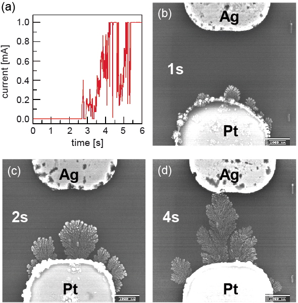 The switching-on process is illustrated in Figure 2. After applying −1 V to a Pt/H2O/Ag cell with a Pt/Ag gap of 3 μm for about 4 s, the cell was switched on (Figure 2(a)). Therefore, −1 V was applied to cells of the same structure for 1, 2 and 4 s, respectively, and the cells were investigated by Scanning Electron Microscopy (SEM) afterwards. According to Figs. 2(b) to (d), metallic dendrites grew from the Pt electrode toward the Ag electrode.