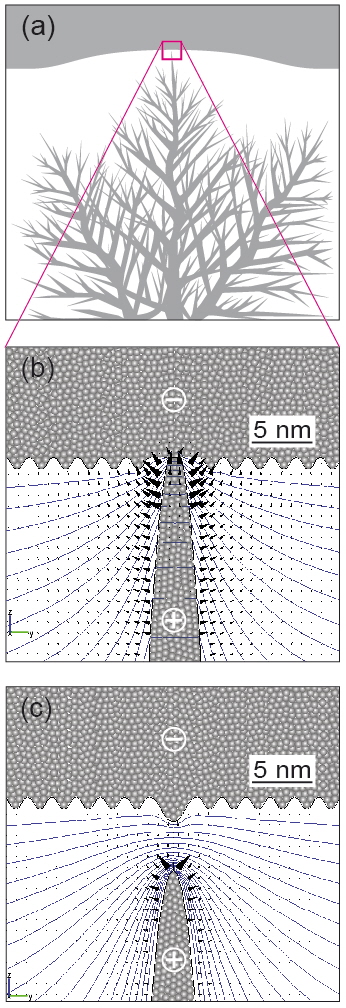 Figure 3: Field simulation results of the front-most Ag dendrite and the Ag electrode: (a) Sketch of the Ag dendrite and the solid Ag electrode in contact. (b) Tip of the Ag dendrite in higher magnification during the late ON-state. The blue lines represent equal potential lines after applying an switching-off voltage of 200 mV. The voltage difference between two adjacent lines is 10 mV. The black cones represent the electrical field and point to the direction of the Ag+ ion migration. (c) Early OFF-state. As soon as the electronic contact is disconnected, the field distribution changes, which accelerates the further dissolution of the dendrite tip.